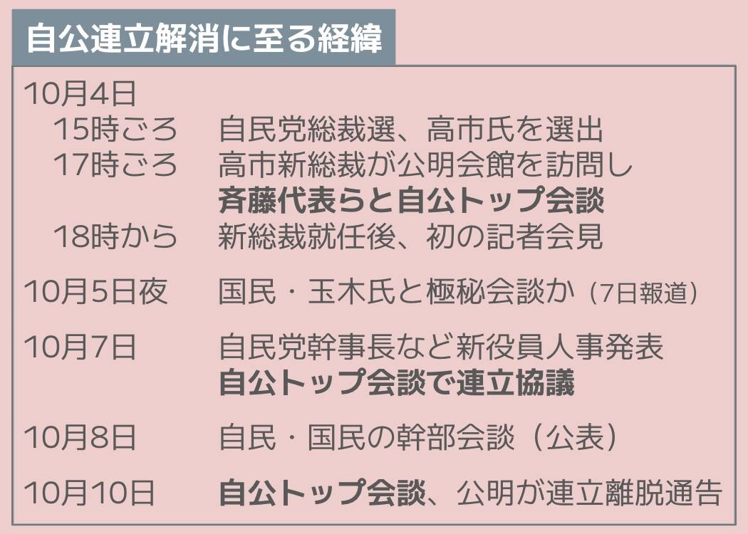TBS「サンデーモーニング」は、公明党が自民党からの連立離脱を通告したことについて、10月12日の放送で取り上げ、共同通信出身の政治ジャーナリスト、後藤謙次氏のコメントを放送した。この中で、後藤氏は、高市氏が決まった直後に国民民主党の玉木雄一郎代表と会ったことなどを挙げ、「公明党を完全にないがしろにした」ことが間違いだったと指摘した。