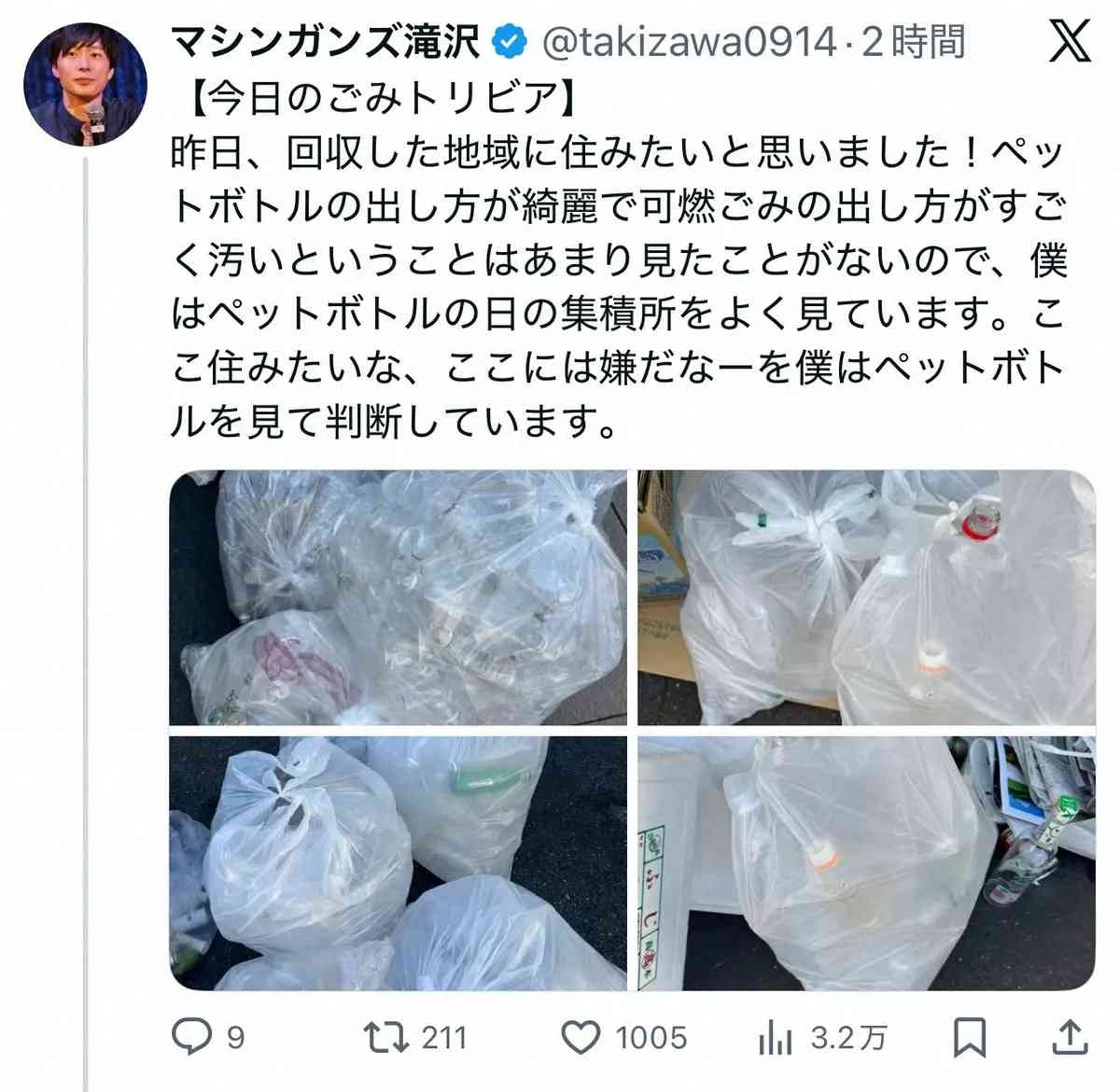 ごみ清掃員としても働くお笑いコンビ「マシンガンズ」滝沢秀一(49)が8日までに自身のXを更新。その地域の住みやすさを見極めるために見るべきポイントを明かした。