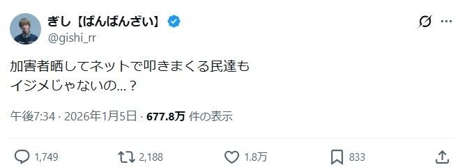 犯罪者批判は正当な行為だろう? - 27 : 2026/01/06 11:30:37 HP6dx