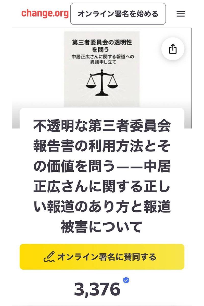 7月31日に署名サイト「Change.org」で立ち上げられた、「不透明な第三者委員会報告書の利用方法とその価値を問う――中居正広さんに関する正しい報道のあり方と報道被害について」と題された署名活動。9月23日までに達成目標として掲げていた3000人を超える賛同者が署名し、その動向に注目が集まっている。