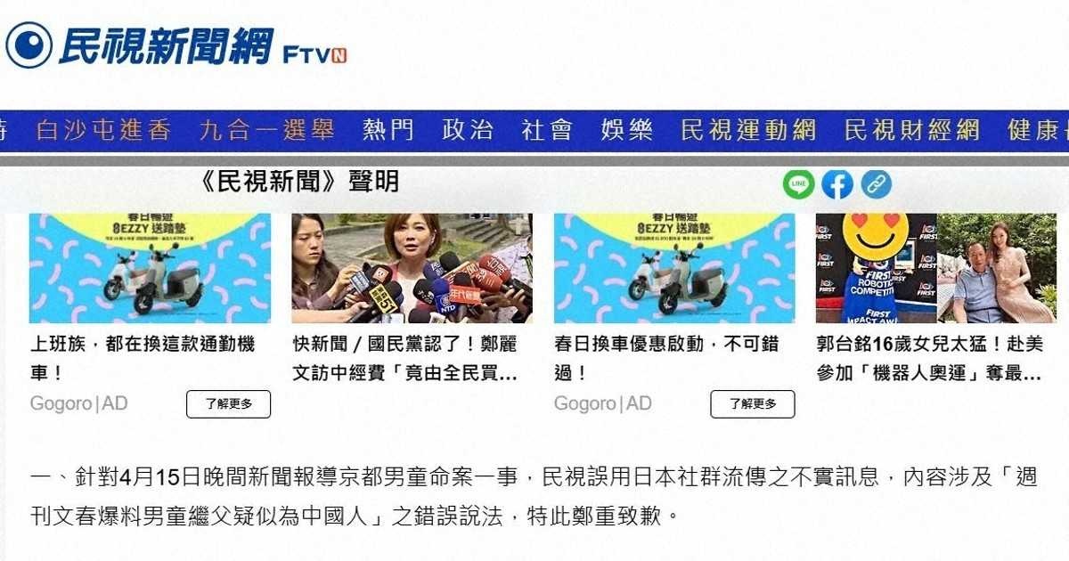 京都男児遺棄 デマ根拠報道の台湾テレビ局がHPでおわび