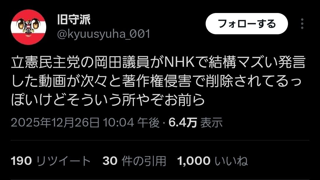 🤡「立憲民主党の失言動画がNHKによって著作権侵害として削除されている そういうところだぞ立憲民主党🫵」高市早苗…