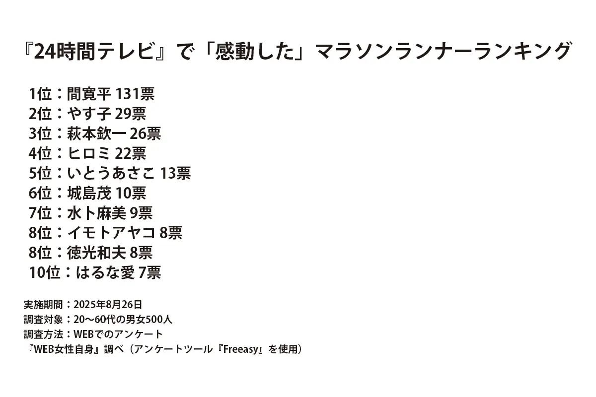 『24時間テレビ』で「感動した」マラソンランナーランキング!3位萩本欽一、2位やす子を抑えた1位は?