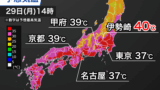 内陸部ではさらに気温が高く、甲府市や京都市で39℃、群馬県伊勢崎市は40℃の予想です。気温が40℃に到達すれば、7日の静岡に次いで今年2回目となります。