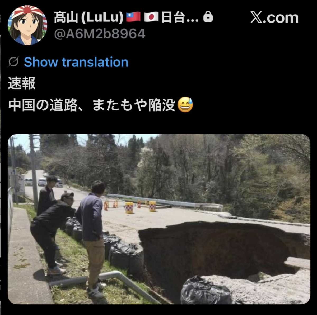 - 例えこれが中国で陥没起きてたとして八潮の穴も塞がってないのに笑えねーだろ