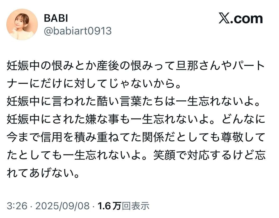 BABIは「妊娠中の恨みとか産後の恨みって旦那さんやパートナーにだけに対してじゃないから」と書き出し、「妊娠中に言われた酷い言葉たちは一生忘れないよ。妊娠中にされた嫌な事も一生忘れないよ」と言及。「どんなに今まで信用を積み重ねてた関係だとしても尊敬してたとしても一生忘れないよ。笑顔で対応するけど忘れてあげない」と怒りをにじませた。