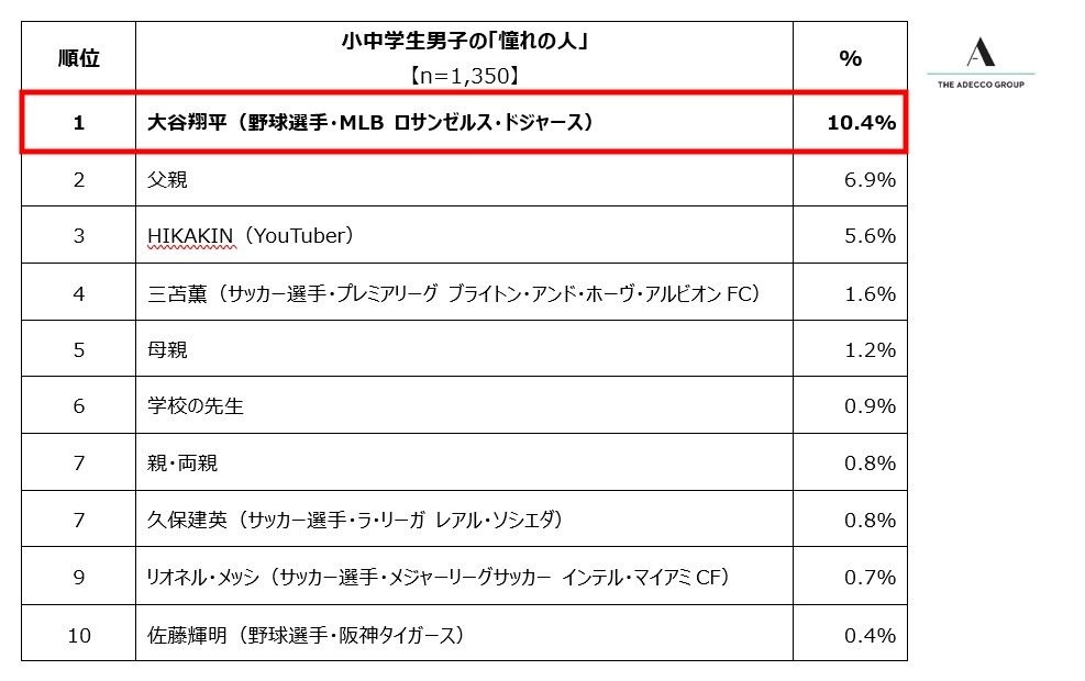 【全国の小中学生の憧れの人は?】男子のトップは 「大谷翔平」(10.4%)、「父親」(6.9%)、「HIKAKIN」(5.6%)、「三笘薫」(1.6%)、「母親」(1.2%)…小中学生の男女2700人(各学年男女150人)調査