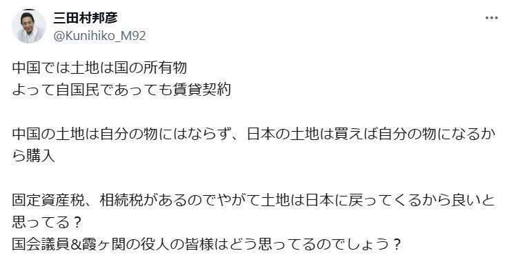 三田村は「中国では土地は国の所有物 よって自国民であっても賃貸契約」と紹介すると「中国の土地は自分の物にはならず、日本の土地は買えば自分の物になるから購入」と現状を分析。「固定資産税、相続税があるのでやがて土地は日本に戻って