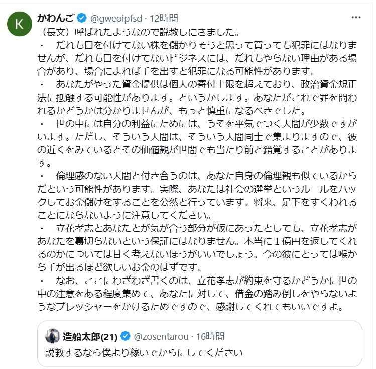 川上氏は、今回の件で物議をかもす造船太郎氏がXユーザーに向けた「説教するなら僕より稼いでからにしてください」との投稿を受け、「呼ばれたようなので説教しにきました」と反応。「あなたがやった資金提供は個人の寄付上限を超えており、政治資金規正法に抵触する可能性があります。というかします。あなたがこれで罪を問われるかどうかは分かりませんが、もっと慎重になるべきでした」とした。