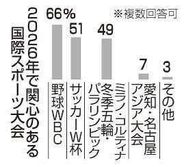 サッカーのワールドカップ(W杯)が51%、ミラノ・コルティナ冬季五輪・パラリンピックが49%で続き、愛知・名古屋アジア大会は7%にとどまった。