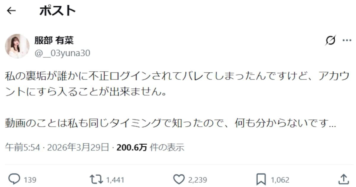当該動画は、元AKB48メンバー・服部有菜(25)のXの裏アカウントから流出したとされており、服部本人は29日にXで「私の裏垢が誰かに不正ログインされてバレてしまったんですけど、アカウントにすら入ることが出来ません。動画のことは私も同じタイミングで知ったので、何も分からないです…」と弁明している。