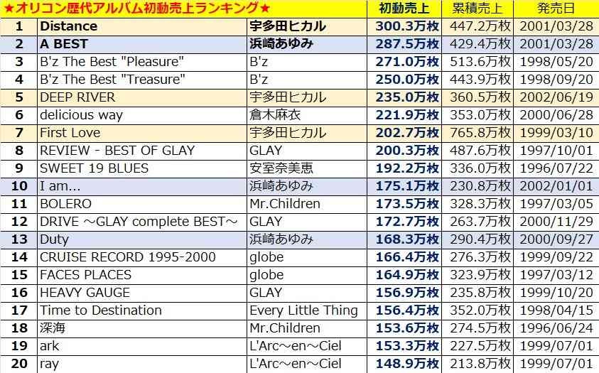 【画像】オリコン「歴代アルバム初動売上ランキング」、ミスチル・宇多田・B’z・GLAY・浜崎あゆみなどが居並ぶ中、6位だけ異質