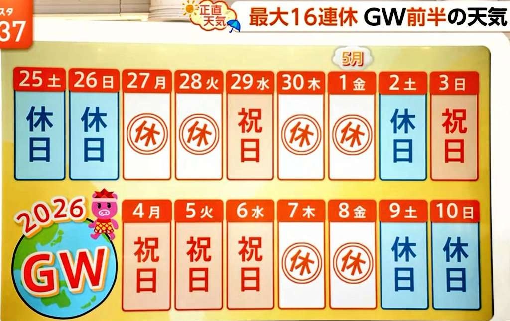 【画像】テレビ「今年のゴールデンウイークは最大16連休!」⇐こんな休みの取り方できるなら祝日の度に大型連休だろと話題