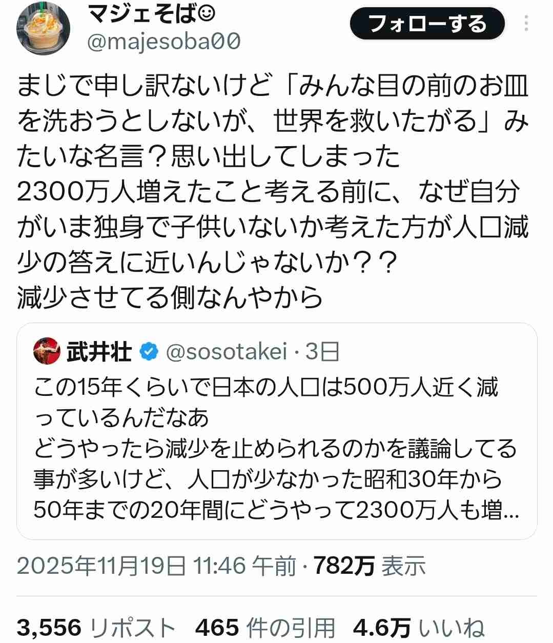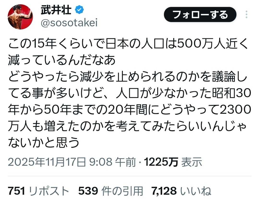 - 武井壮「どうしたら人口減少止まるかより昔はなんで増えたのかを考えた方が良い」
