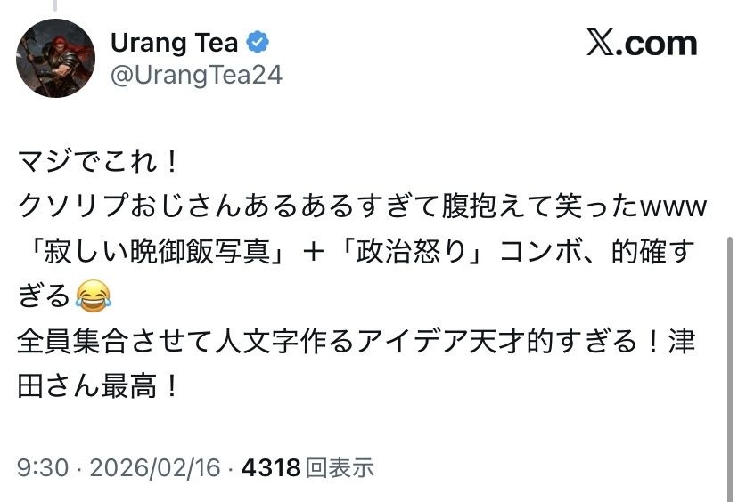 イライラと孤独を忘れるために芸能人に絡んだり、政治に文句言ってるんだろうな - 55 : 2026/02/16(月) 21:56:27.11 ID:VEG2UI980