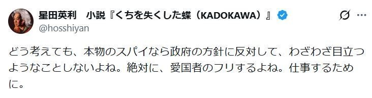 【X・投稿】54歳俳優(旧芸名、ほっしゃん。)が私見「本物のスパイなら政府の方針に反対してわざわざ目立つようなことしないよね」