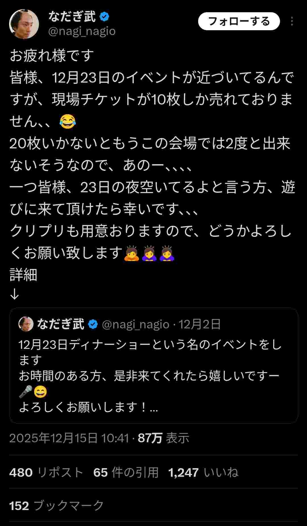 なだぎ武さん、クリスマスディナーショーのチケットが10枚しか売れず終わるwww