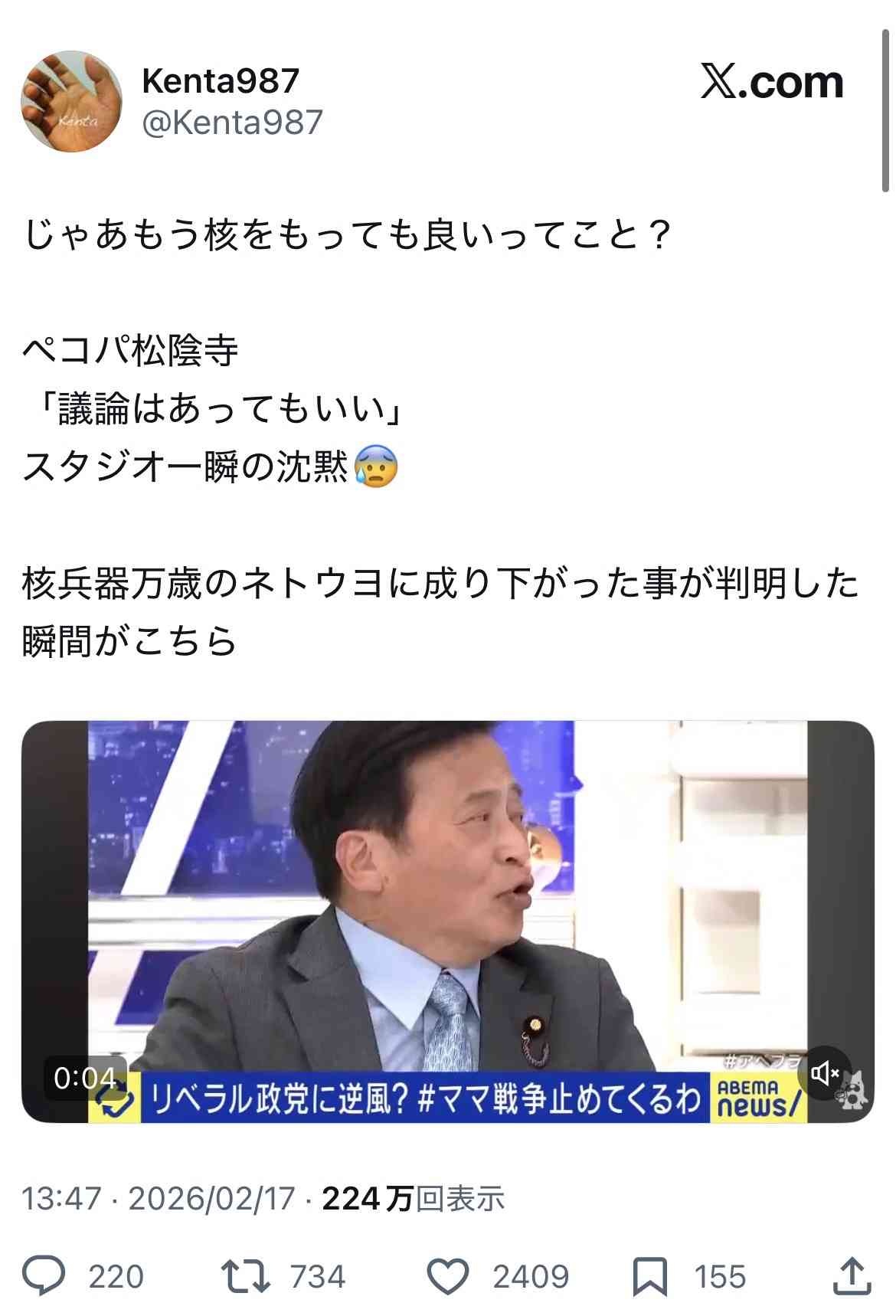 ぺこぱ松陰寺「日本が核兵器を持つことについて『議論はあってもいい』」核兵器賛成派のネトウヨだとリベラルから叩かれてしまう…