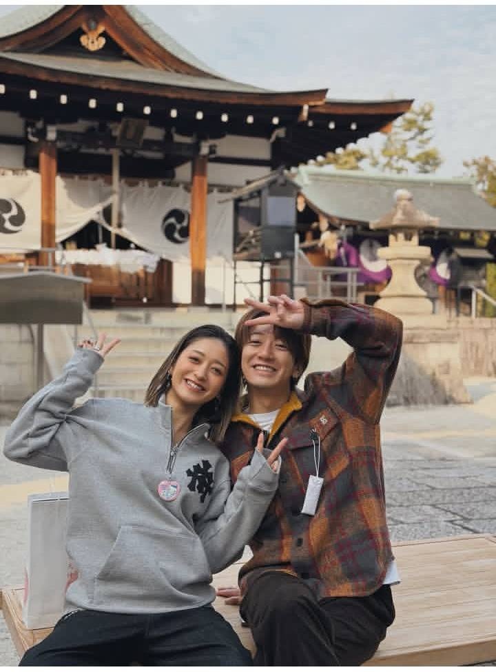仕事に関しては「無理のない範囲で働けるだけ働かせていただく予定です!今後とも温かく見守ってください」と呼びかけ、夫・大倉と安産祈願に訪れた際の2ショットを公開した。