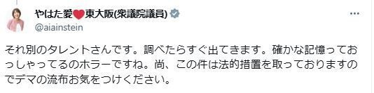 「尚、この件は法的措置を取っておりますのでデマの流布お気をつけください」と呼びかけた。