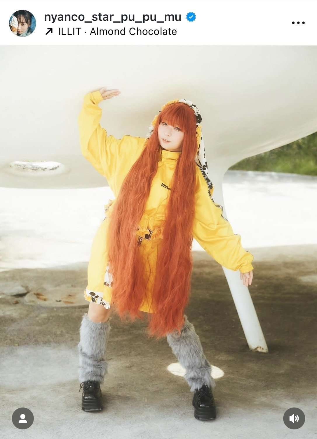 また、もう1パターンのビジュアルも公開。膝まで伸びたオレンジのロングヘアに、イエ口ージャージ、グレーのファー調レッグウォーマー、厚底シューズを合わせた、独自のバランス感をもった装いを披露している。「小高さんやみなさんが『アンゴラにはこんなの衣装が似合うのでは!?』というものを考えて新しく作ってきてくれました!」と紹介した。