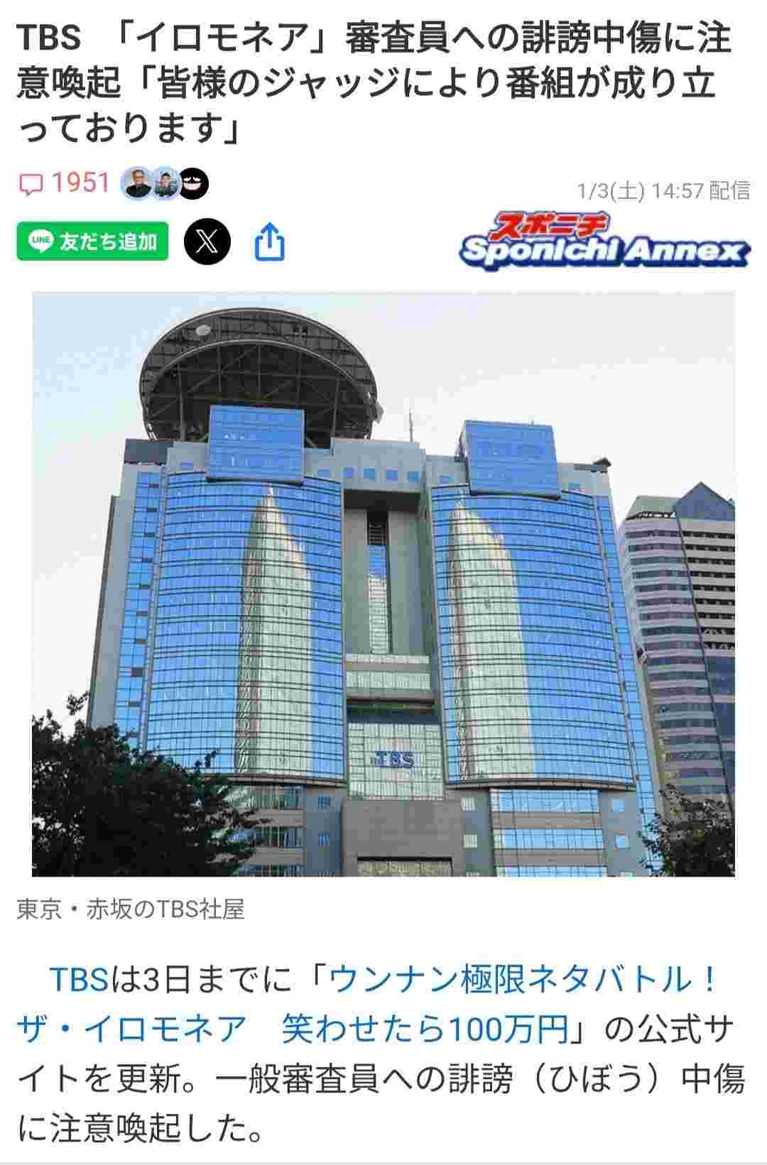 - TBS 「イロモネア」審査員への誹謗中傷に注意喚起「皆様のジャッジにより番組が成り立っております」