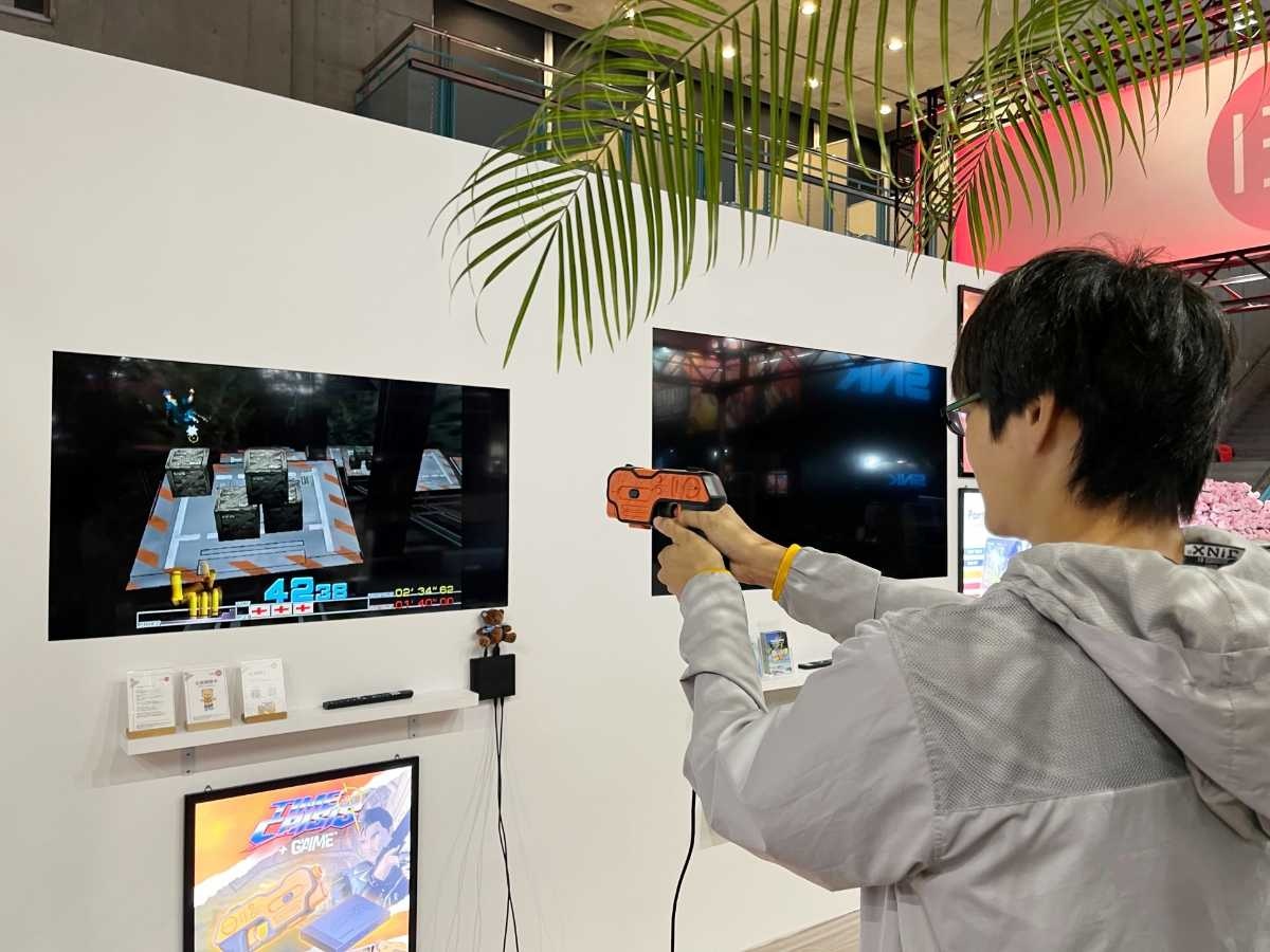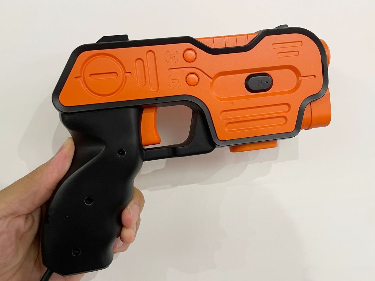 「G’AIM’E」のガンコンには、過去のライトガンで一般的だった赤外線ではなく、高解像度カメラとAIを活用した、独自の技術が搭載。銃口にあるカメラが液晶モニターを認識し、照準を自動調整するというもので、プレイする画面にカメラを設置したり、また画面の大きさや距離に関係なくすぐにプレイが可能となる。