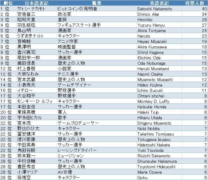 - 日本人に聞いたらビットコイン創始者なんて下位の方だと思うw