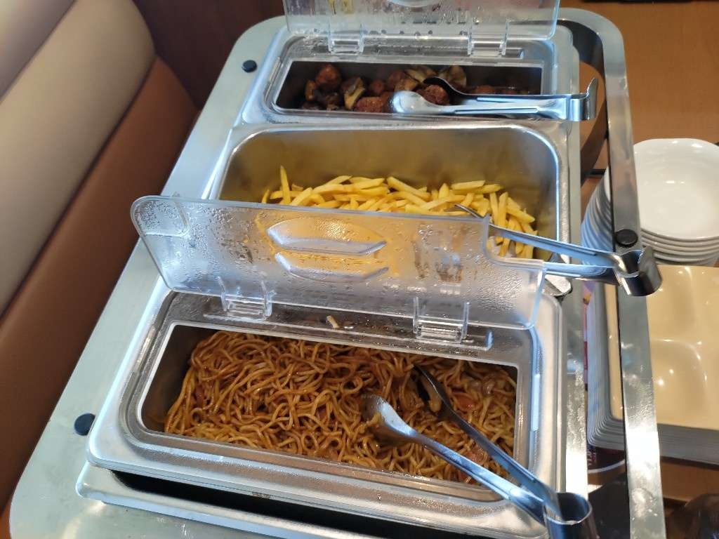 焼きそば、ポテト、茄子と肉団子煮たやつ