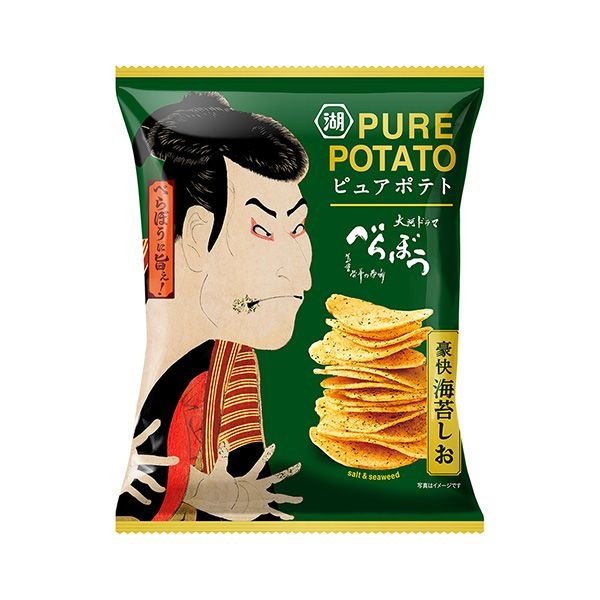 商品概要:「ピュアポテト」シリーズ新アイテム。日本、江戸をテーマにした商品。こだわりのブレンド海苔の風味でジャガイモの香ばしさを引き出した、いつまでも頬張り続けたくなるような“べらぼう”にうめぇ1枚。大河ドラマ“べらぼう~蔦重栄華乃夢噺~”の放送をきっかけに開発した商品。