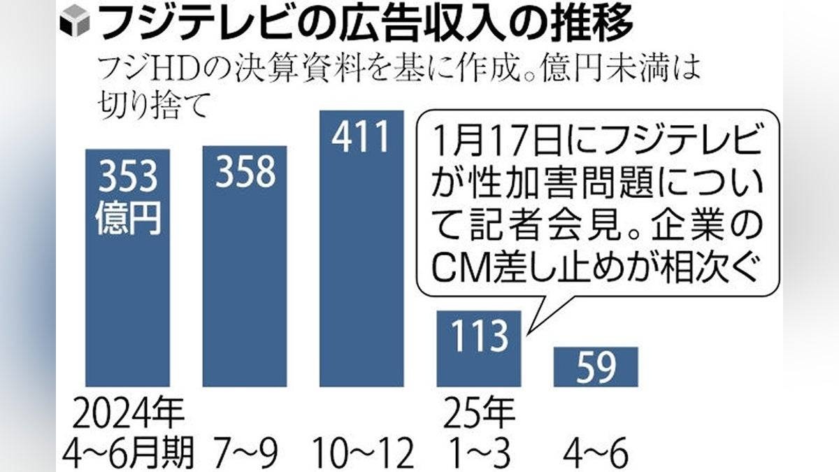 31日に発表した25年4~6月期連結決算は、営業利益が127億円の赤字となった。最終利益は前年同期比85・1%減の10億円だった。フジテレビの広告収入は59億円で、前年同期比で83・1%減少した。不動産などの「都市開発・観光事業」は堅調で、売上高が前年同期比62・9%増だった。