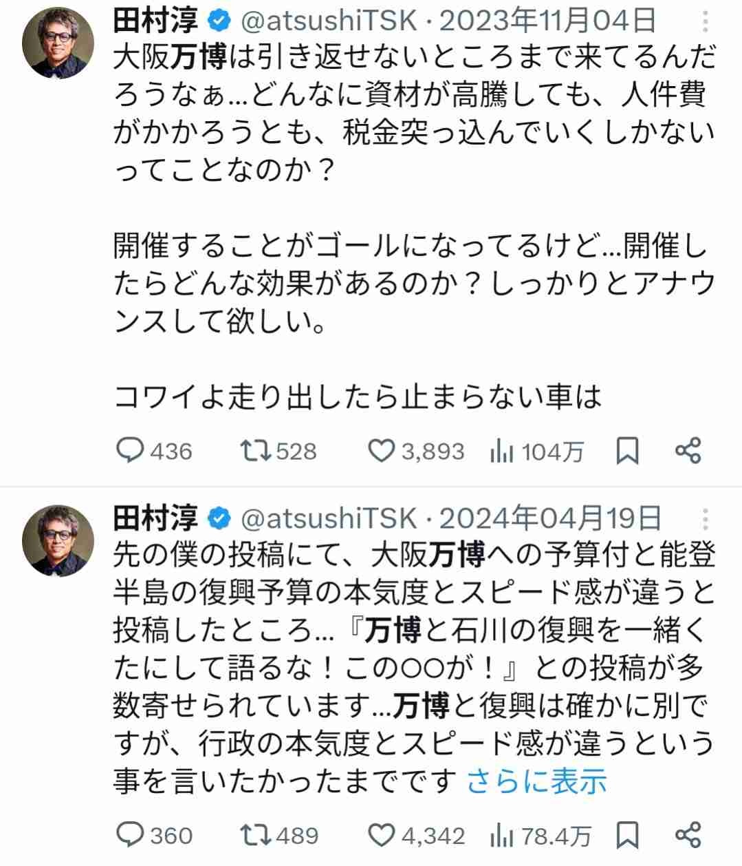 万博反対してたけど来てみたら良かった! 素晴らしいことだでも反対グッズまで販売して、もう予約も取れないタイミングで芸能人特権で有名パビリオン見て回って嬉しげにポストしたらそら燃えるわ…