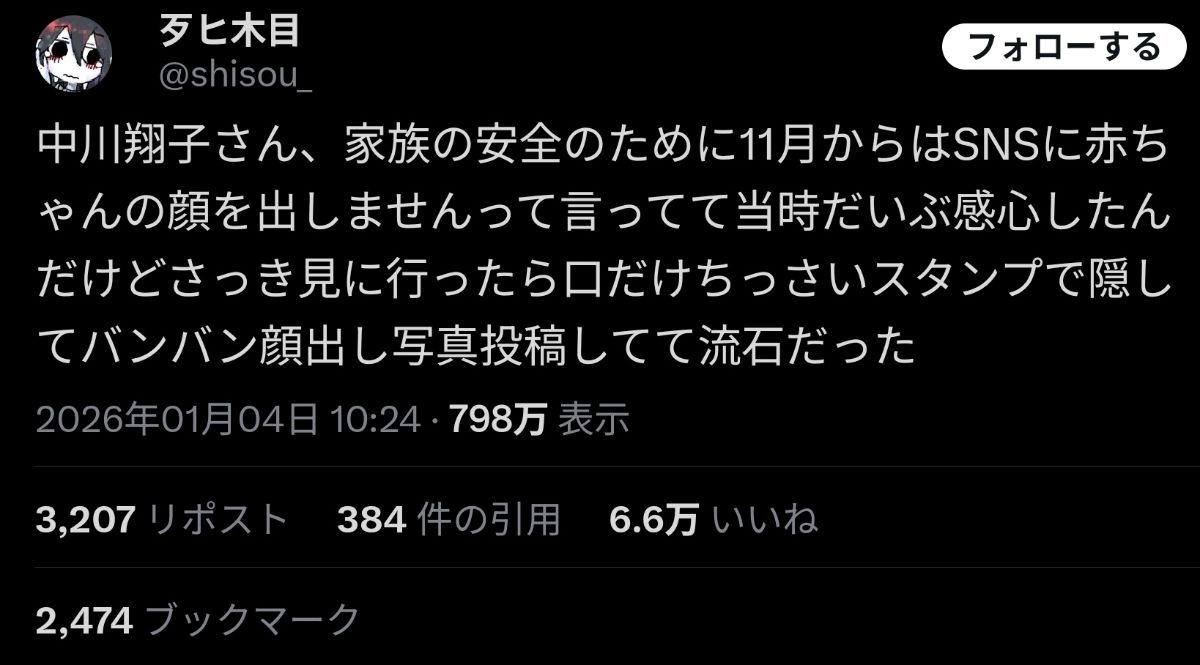 自分の顔をこれだけ加工してるんだから赤ちゃんの顔もガッツリ加工してるでしょ - 39 : 2026/01/05(月) 13:05:53.64 ID:SJl0IaL+0
