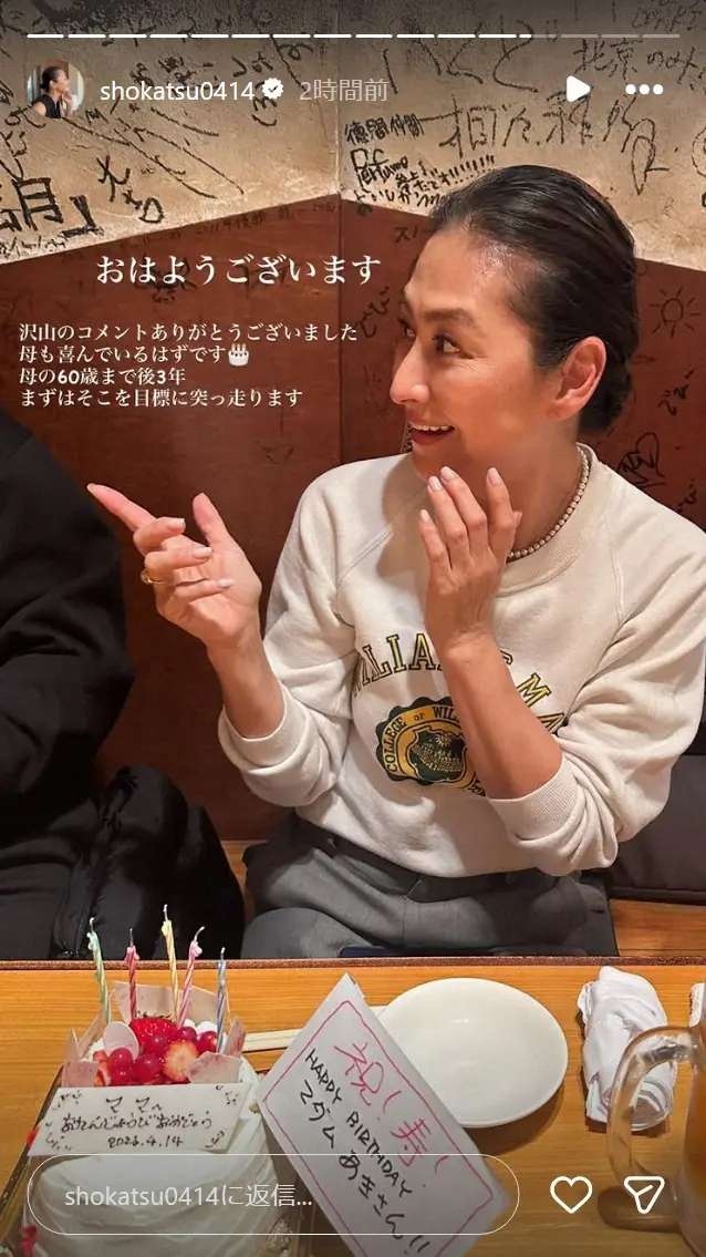 「ママへ おたんじょうびおめでとう」のプレートとろうそくが乗ったホールケーキ、「HAPPY BIRTHDAYマダムあきさん」と書かれたメッセージカードを前に笑顔の自身や、息子たちが肉を焼く姿、隣に座る清原氏の写真を投稿。