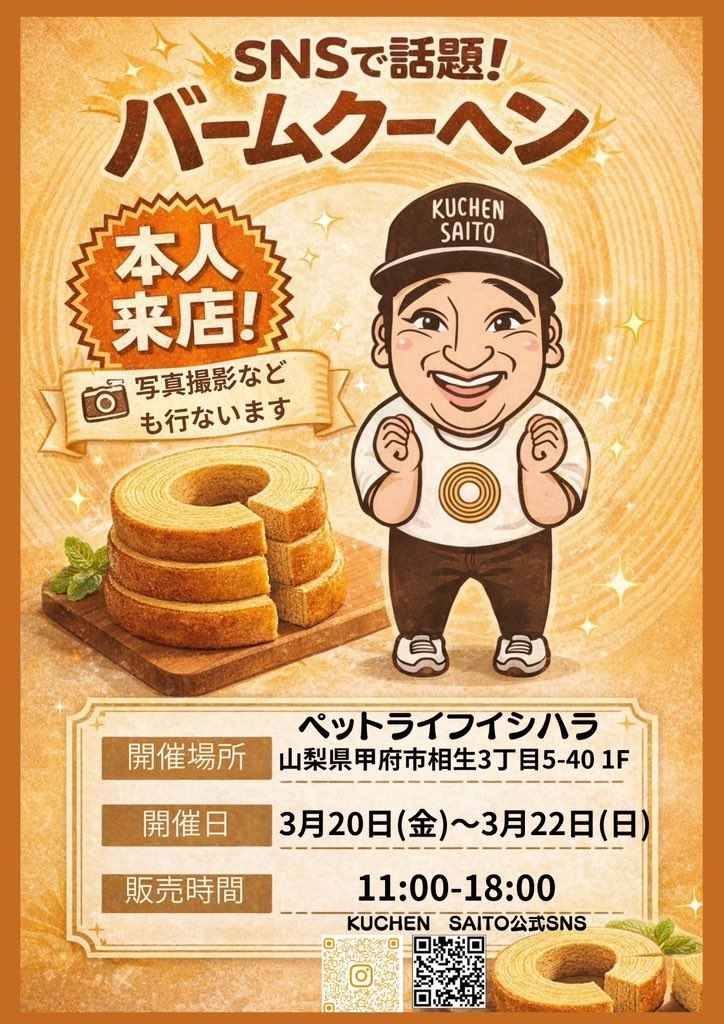 お笑いトリオ「ジャングルポケット」の元メンバー・斉藤慎二被告がバウムクーヘンを販売している「クーヘンSAITO」の公式Xが18日までに更新され、20日から22日までの3日間に山梨・甲府市内でバウムクーヘンを販売すると告知した。