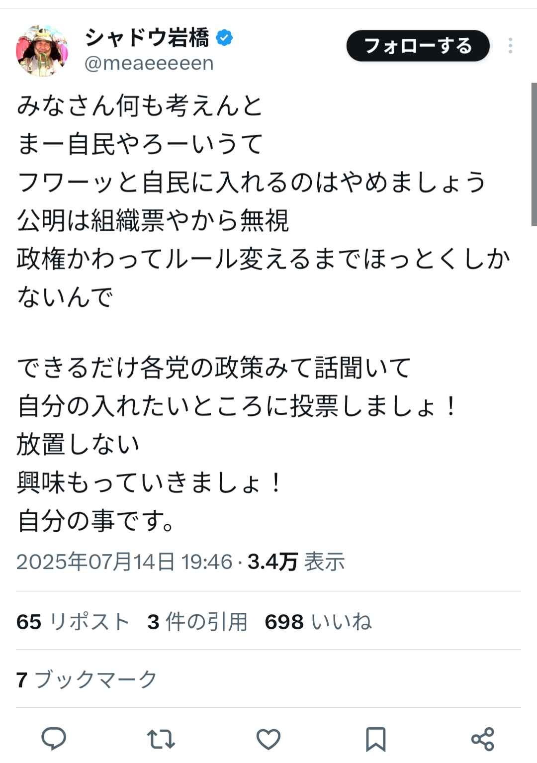 コイツも1票持ってるんだな… - 45 : 2025/07/16(水) 19:51:25.96 ID:tpzHhbWu0
