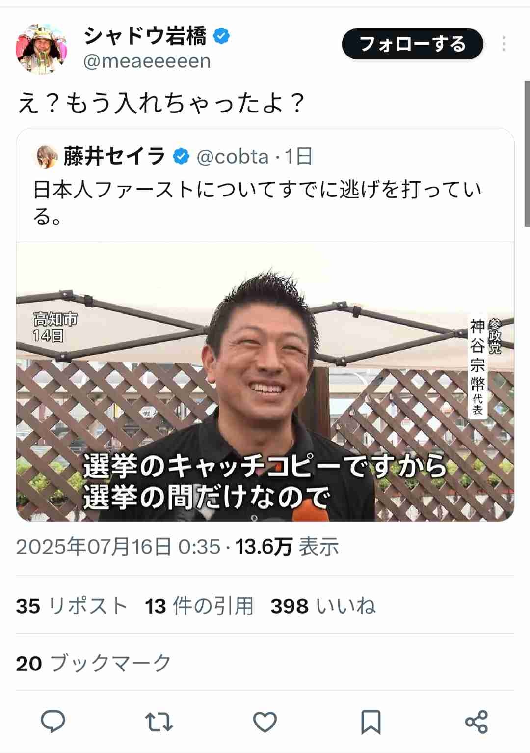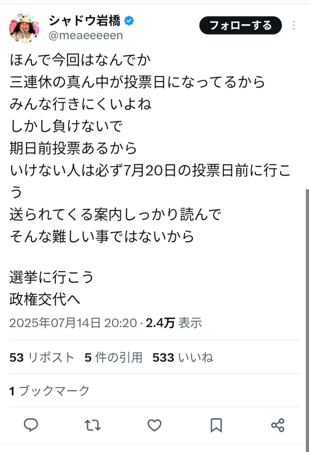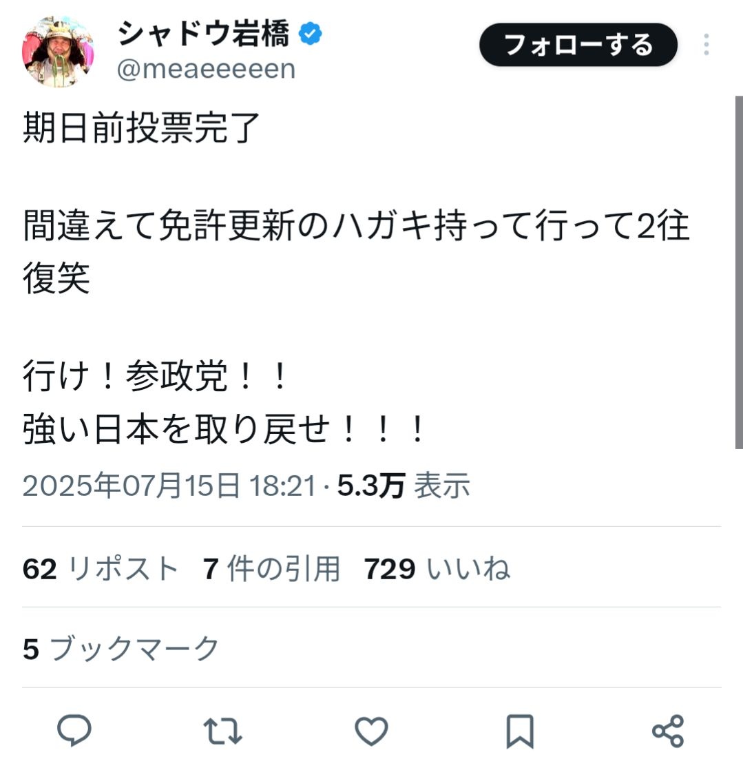 元プラスマイナス岩橋、参政党に投票「行け!参政党!!強い日本を取り戻せ!!!」