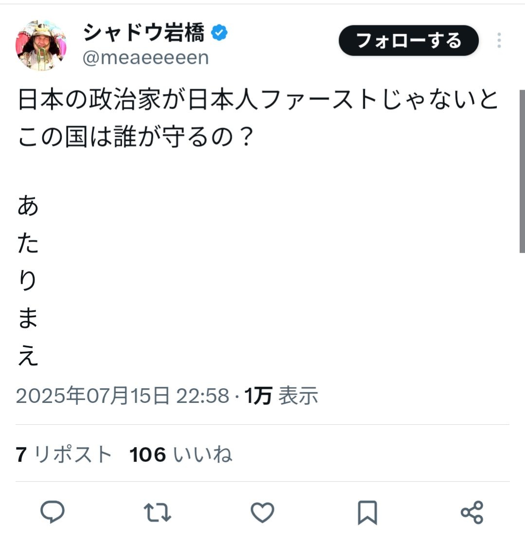 コイツも1票持ってるんだな… - 45 : 2025/07/16(水) 19:51:25.96 ID:tpzHhbWu0