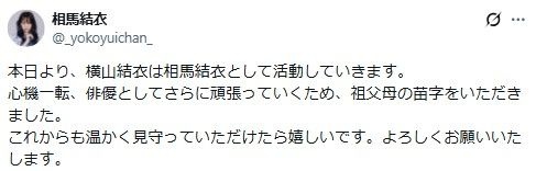 横山は「本日より、横山結衣は相馬結衣として活動していきます」と報告。「心機一転、俳優としてさらに頑張っていくため、祖父母の苗字をいただきました」と説明し「これからも温かく見守っていただけたら嬉しいです。よろしくお願いいたします」と呼びかけた。