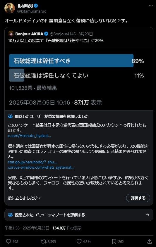 北村晴男議員「日本保守党によるアンケート結果で石破辞めろが多数。NHKの世論調査はおかしい!」