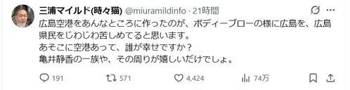 あそこに空港あって、誰が幸せですか?」などとつづり、広島空港の立地に疑問を投げかけていた。このポストには200件に迫るコメントが寄せられていた。