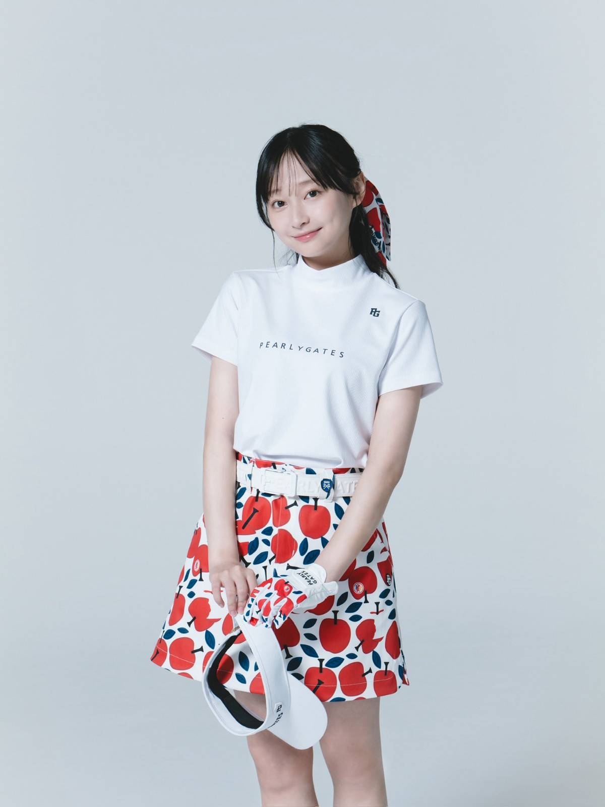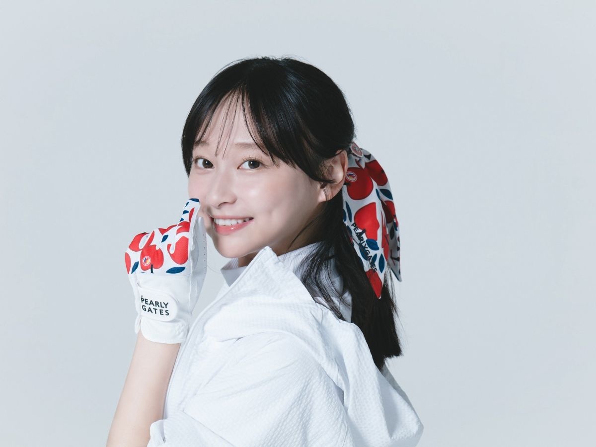 Xでは、ゴルフアパレルブランド「PEARLY GATES(パーリーゲイツ)」のコンテンツに出演したことを報告。リンゴ柄のミニスカート姿で髪にはリボンをつけ、キュートなビジュアルを公開した。