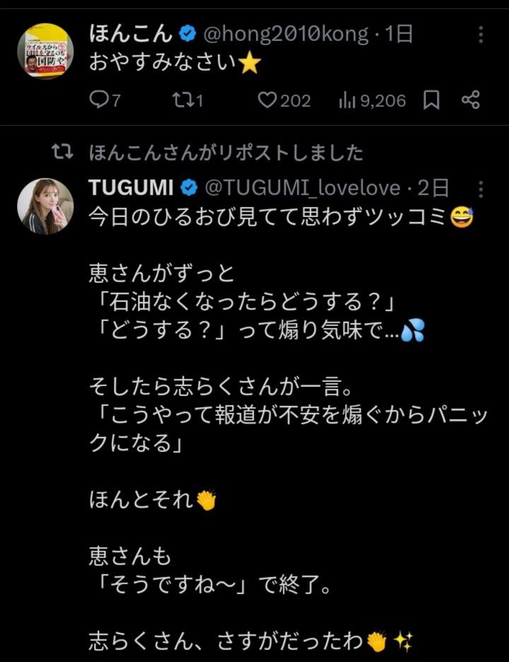 - それで本当に石油無くなったら諸悪の根源の高市を叩かずに煽らなかったメディアが悪い!とか言い出すんだろう?