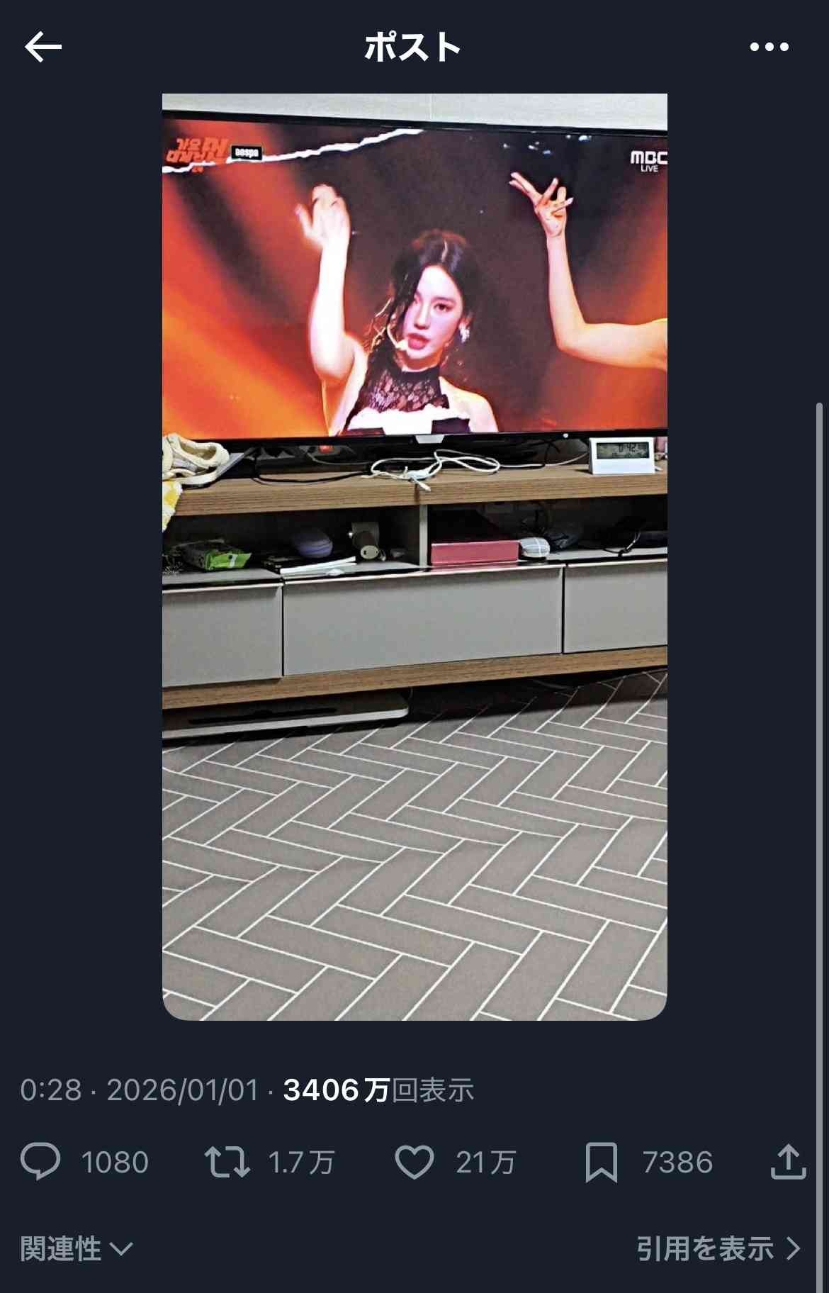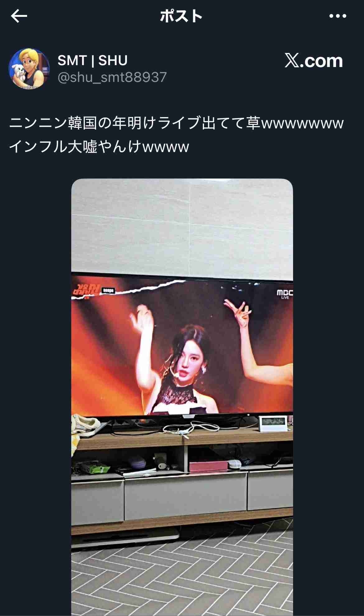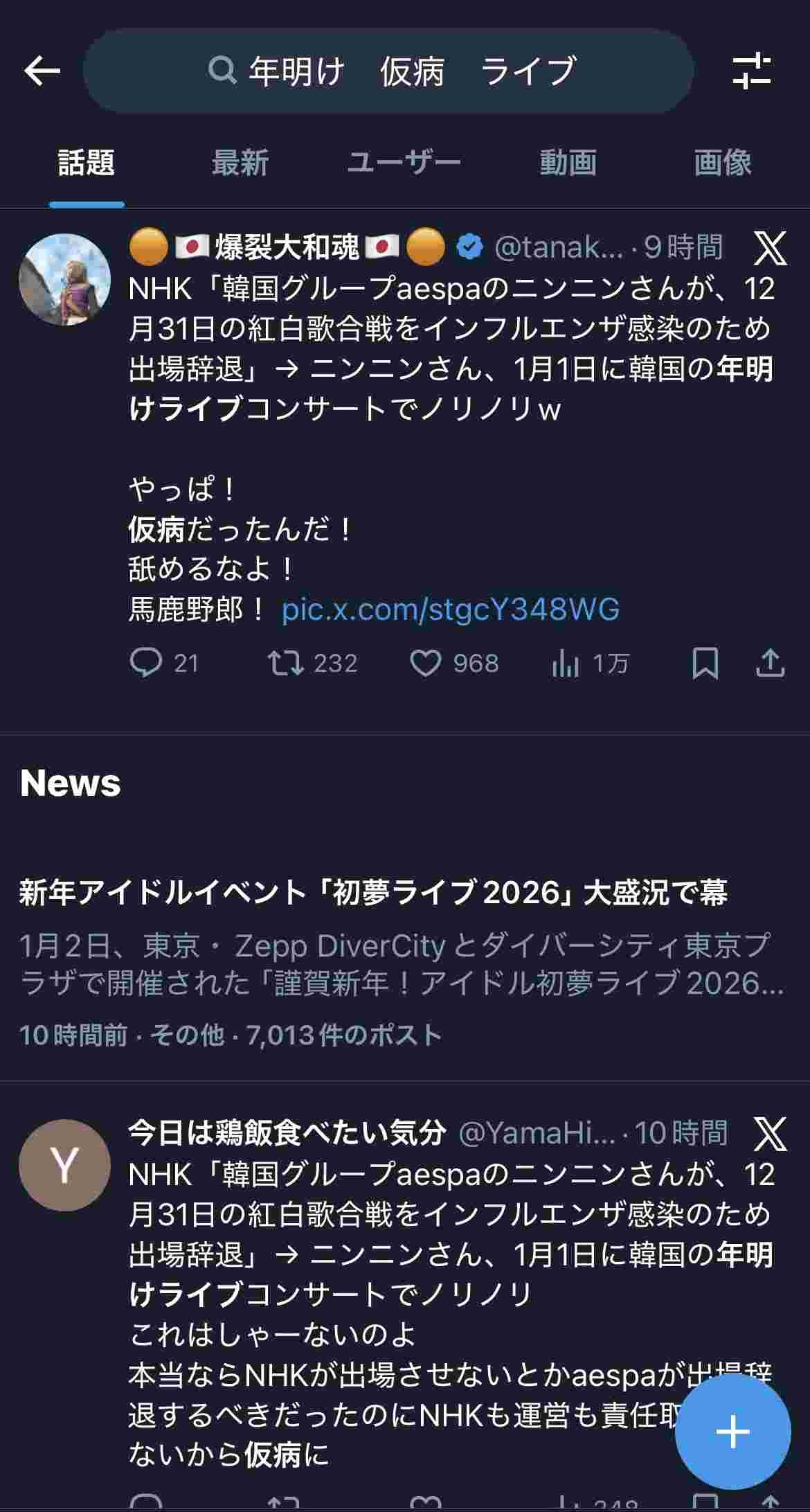 愛国者「aespaが20時に紅白に出たあと韓国に移動して年越しカウントダウンライブに出た!仮病だ!」突っ込み殺到してツイ消し