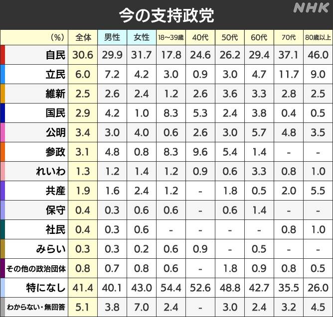 政党支持率(40代) 自民24.6 立民0.9 維新2.6 国民5.3 参政9.6 NHK世論調査