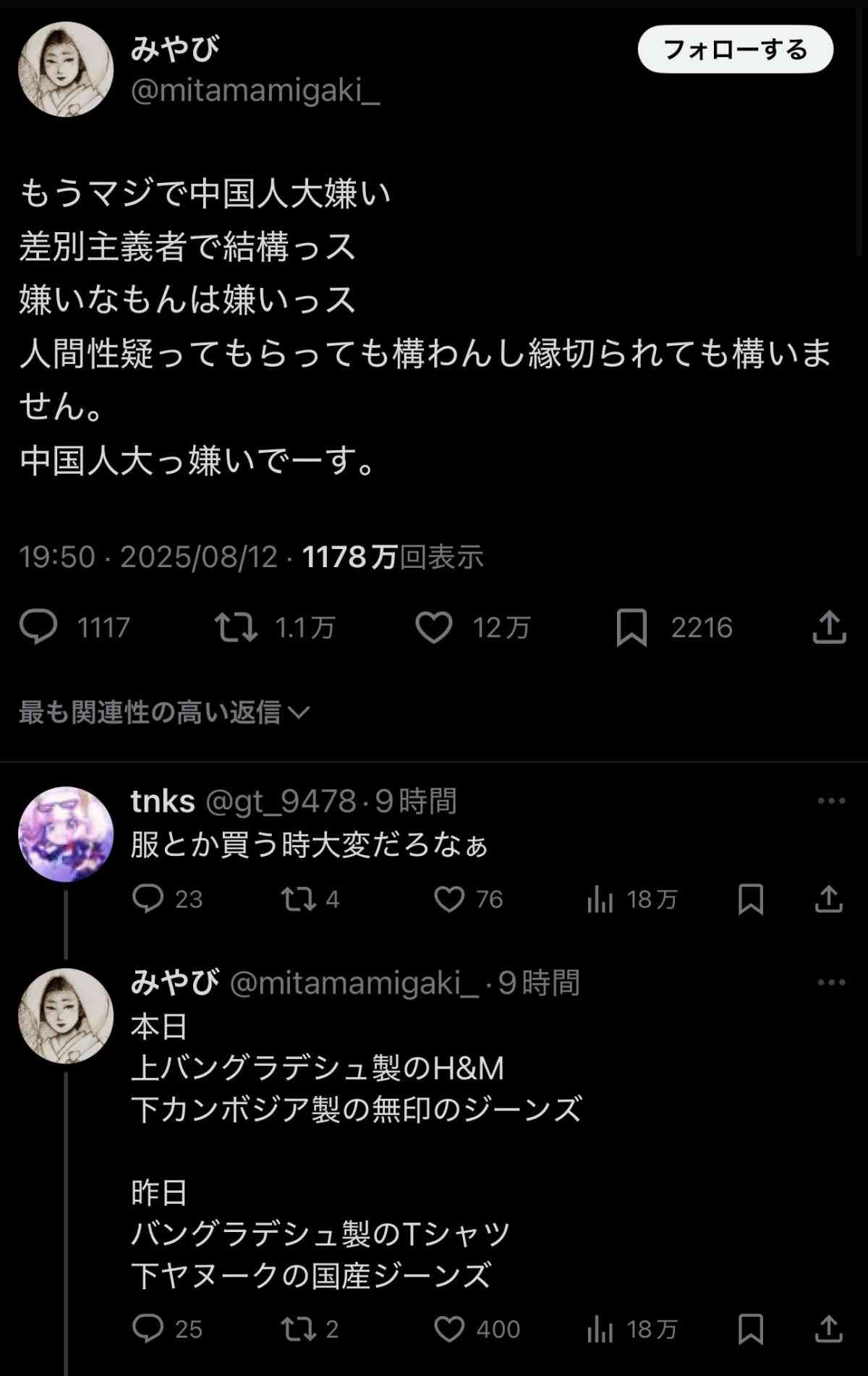 日本人女「中国人大っっっ嫌い!差別主義者で結構っス!」→驚異の12万いいね これがさや姉が望む日本