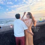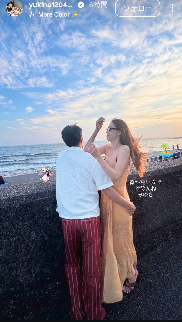 ストーリーズに、夕焼けの海辺の写真をアップした木下さん。自身の腰に手を回す男性との2ショットには「背が高い女でごめんねみゆき」と記した。