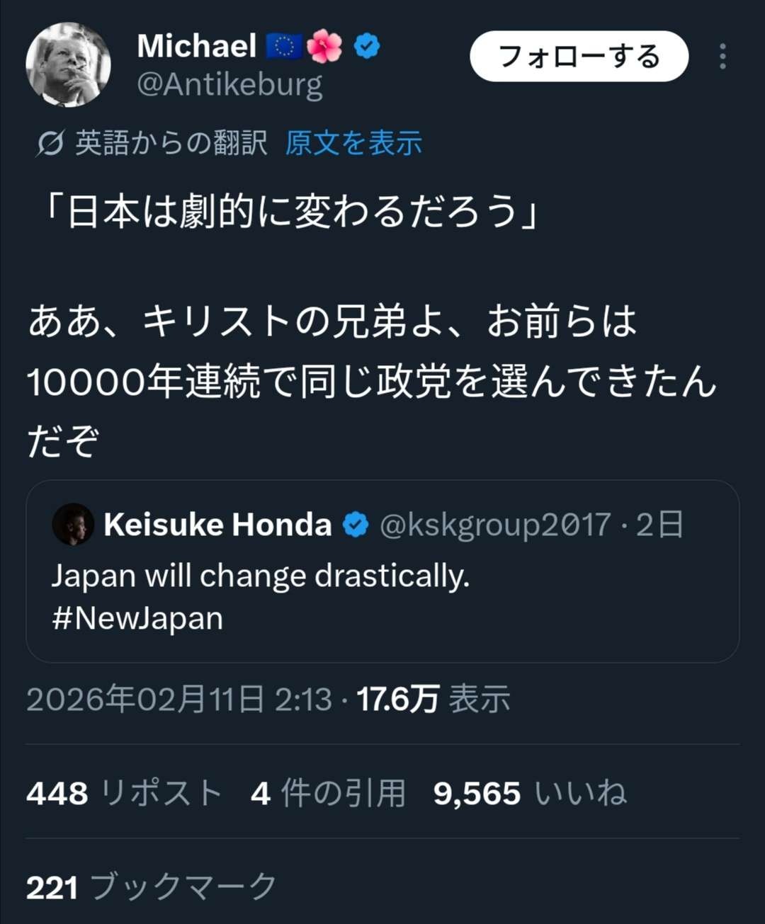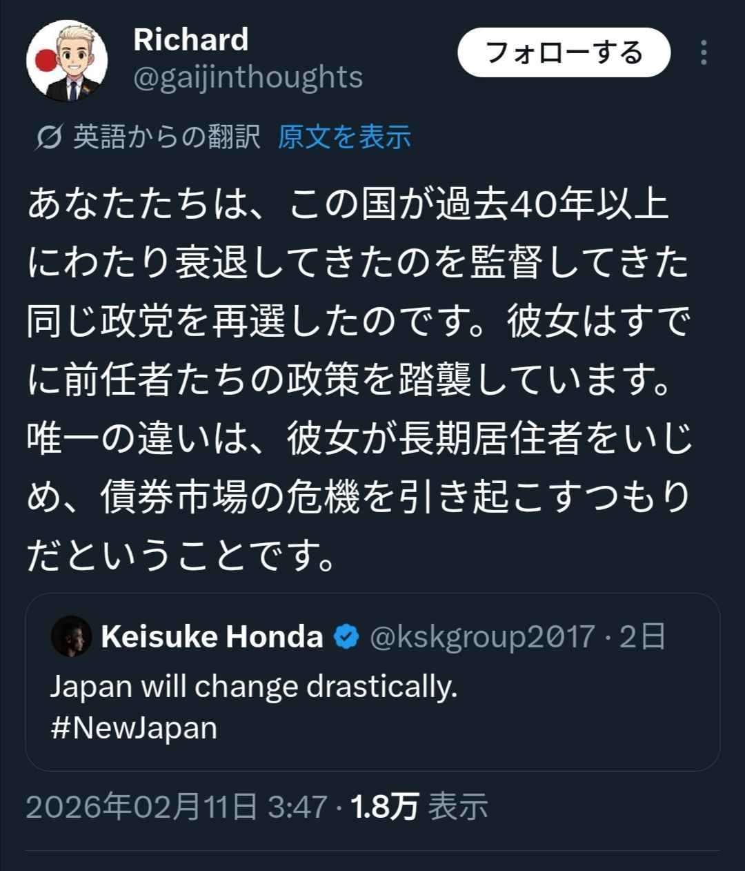本田圭佑「高市さんが日本を変える!」←海外民、失笑へwww