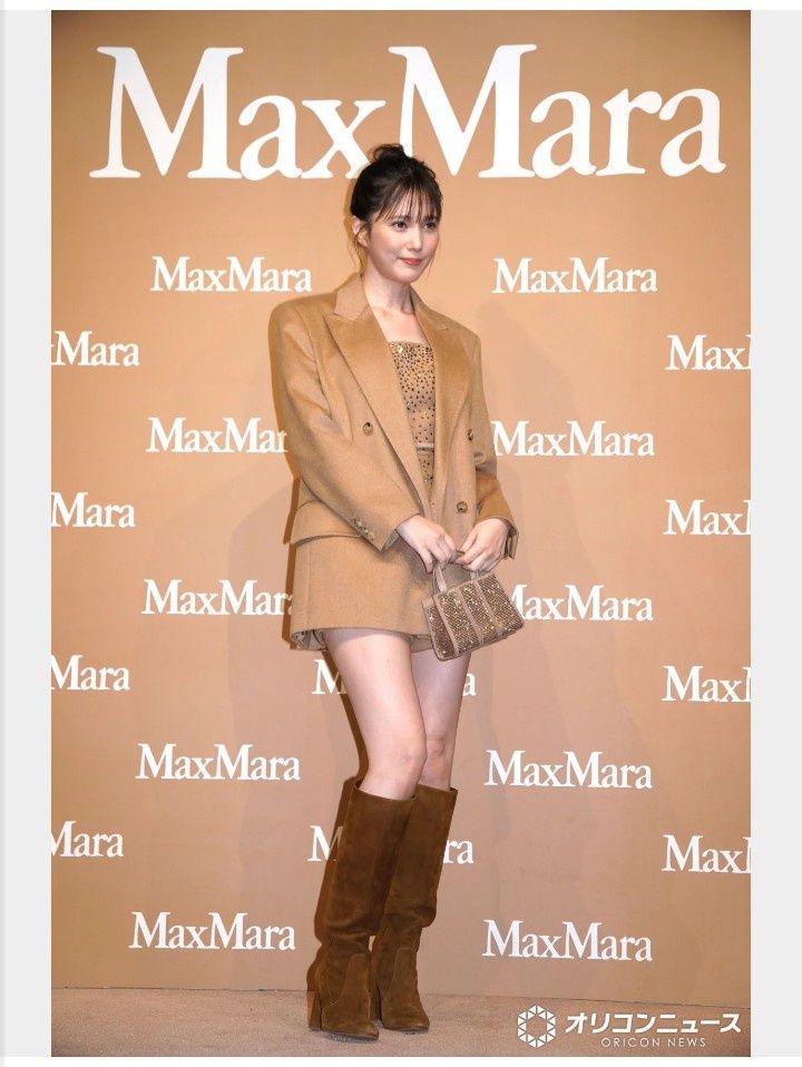 本田は、ミニスカートにオリンピアジャケットを合わせたオールキャメルのスタイリングで登場。