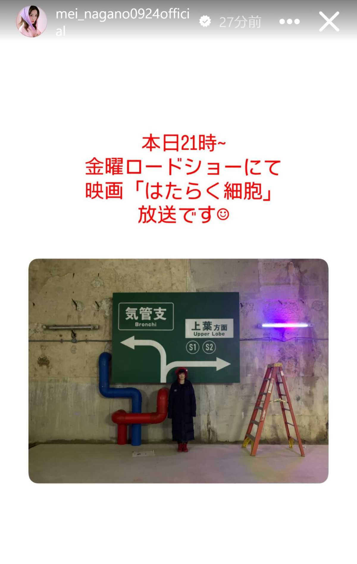 永野はストーリーズを更新。「本日21時~ 金曜ロードショーにて映画『はたらく細胞』放送です」と告知した。